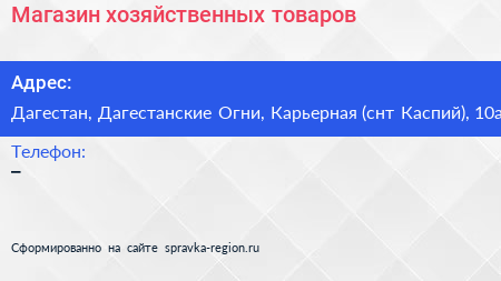 Магазин хозяйственных товаров по адресу Дагестан, Дагестанские Огни, Карьерная (снт Каспий), 10а в дальнейшем Организация, размещена в следующих категориях: