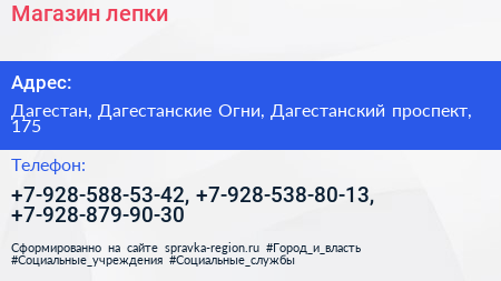 Магазин лепки по адресу Дагестан, Дагестанские Огни, Дагестанский проспект, 175 в дальнейшем Организация, размещена в следующих категориях: