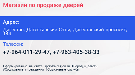 Магазин по продаже дверей по адресу Дагестан, Дагестанские Огни, Дагестанский проспект, 144 в дальнейшем Организация, размещена в следующих категориях: