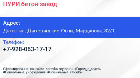 НУРИ бетон, завод по адресу Дагестан, Дагестанские Огни, Марданова, 82/1 в дальнейшем Организация, размещена в следующих категориях: