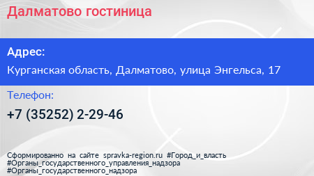 Далматово, гостиница по адресу Курганская область, Далматово, улица Энгельса, 17 в дальнейшем Организация, размещена в следующих категориях: