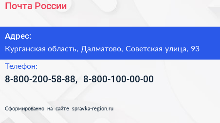Почта России по адресу Курганская область, Далматово, Советская улица, 93 в дальнейшем Организация, размещена в следующих категориях: