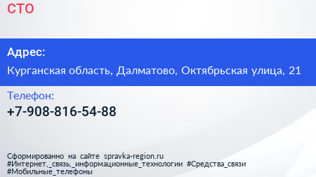 СТО по адресу Курганская область, Далматово, Октябрьская улица, 21 в дальнейшем Организация, размещена в следующих категориях: