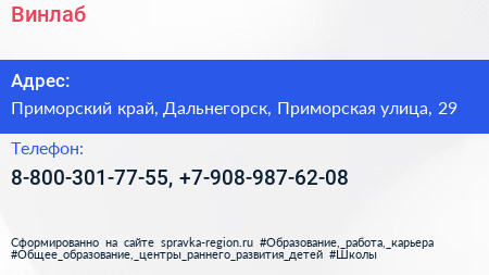 Винлаб по адресу Приморский край, Дальнегорск, Приморская улица, 29 в дальнейшем Организация, размещена в следующих категориях: