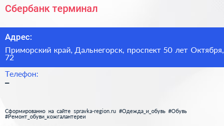 Сбербанк, терминал по адресу Приморский край, Дальнегорск, проспект 50 лет Октября, 72 в дальнейшем Организация, размещена в следующих категориях: