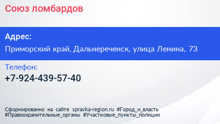 Союз ломбардов по адресу Приморский край, Дальнереченск, улица Ленина, 73 в дальнейшем Организация, размещена в следующих категориях: