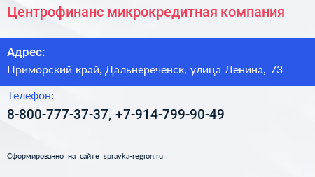 Центрофинанс, микрокредитная компания по адресу Приморский край, Дальнереченск, улица Ленина, 73 в дальнейшем Организация, размещена в следующих категориях: