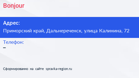 Bonjour по адресу Приморский край, Дальнереченск, улица Калинина, 72 в дальнейшем Организация, размещена в следующих категориях: