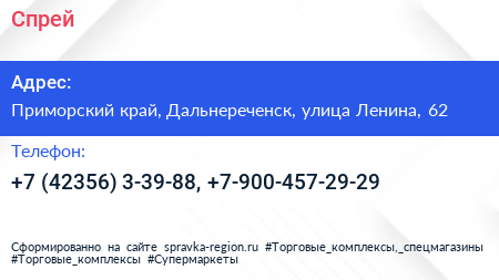 Спрей по адресу Приморский край, Дальнереченск, улица Ленина, 62 в дальнейшем Организация, размещена в следующих категориях: