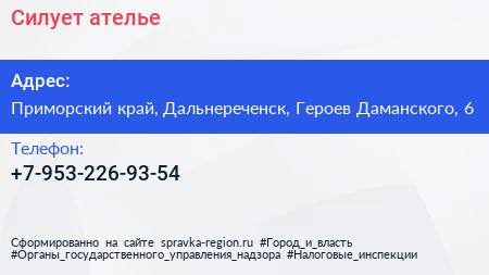 Силует, ателье по адресу Приморский край, Дальнереченск, Героев Даманского, 6 в дальнейшем Организация, размещена в следующих категориях: