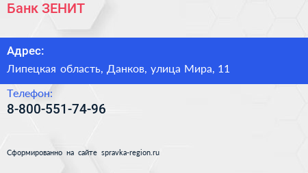 Банк ЗЕНИТ по адресу Липецкая область, Данков, улица Мира, 11 в дальнейшем Организация, размещена в следующих категориях: