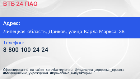 ВТБ 24, ПАО по адресу Липецкая область, Данков, улица Карла Маркса, 38 в дальнейшем Организация, размещена в следующих категориях: