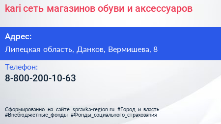 kari, сеть магазинов обуви и аксессуаров по адресу Липецкая область, Данков, Вермишева, 8 в дальнейшем Организация, размещена в следующих категориях: