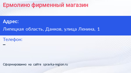 Ермолино, фирменный магазин по адресу Липецкая область, Данков, улица Ленина, 1 в дальнейшем Организация, размещена в следующих категориях: