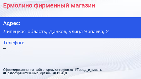 Ермолино, фирменный магазин по адресу Липецкая область, Данков, улица Чапаева, 2 в дальнейшем Организация, размещена в следующих категориях: