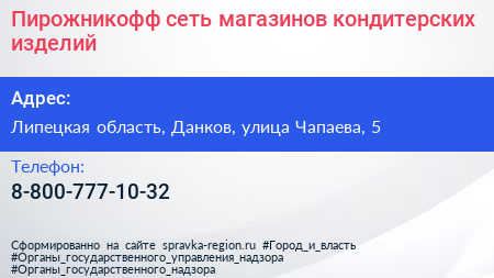 Пирожникофф, сеть магазинов кондитерских изделий по адресу Липецкая область, Данков, улица Чапаева, 5 в дальнейшем Организация, размещена в следующих категориях: