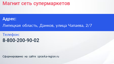 Магнит, сеть супермаркетов по адресу Липецкая область, Данков, улица Чапаева, 2/7 в дальнейшем Организация, размещена в следующих категориях: