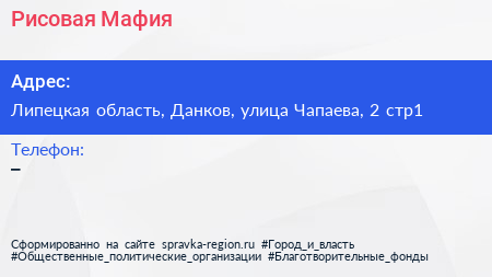 Рисовая Мафия по адресу Липецкая область, Данков, улица Чапаева, 2 стр1 в дальнейшем Организация, размещена в следующих категориях:
