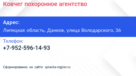 Ковчег, похоронное агентство по адресу Липецкая область, Данков, улица Володарского, 36 в дальнейшем Организация, размещена в следующих категориях: