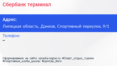 Сбербанк, терминал по адресу Липецкая область, Данков, Спортивный переулок, 9/1 в дальнейшем Организация, размещена в следующих категориях: