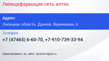 Липецкфармация, сеть аптек по адресу Липецкая область, Данков, Вермишева, 6 в дальнейшем Организация, размещена в следующих категориях: