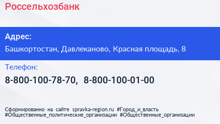 Россельхозбанк по адресу Башкортостан, Давлеканово, Красная площадь, 8 в дальнейшем Организация, размещена в следующих категориях: