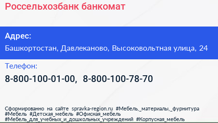 Россельхозбанк, банкомат по адресу Башкортостан, Давлеканово, Высоковольтная улица, 24 в дальнейшем Организация, размещена в следующих категориях: