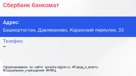 Сбербанк, банкомат по адресу Башкортостан, Давлеканово, Каранский переулок, 33 в дальнейшем Организация, размещена в следующих категориях: