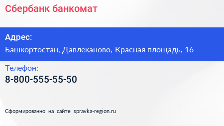 Сбербанк, банкомат по адресу Башкортостан, Давлеканово, Красная площадь, 16 в дальнейшем Организация, размещена в следующих категориях: