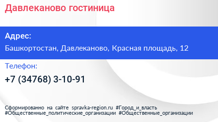 Давлеканово, гостиница по адресу Башкортостан, Давлеканово, Красная площадь, 12 в дальнейшем Организация, размещена в следующих категориях: