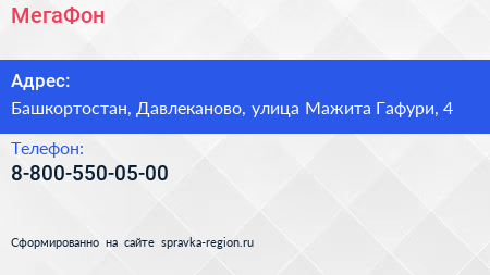 МегаФон по адресу Башкортостан, Давлеканово, улица Мажита Гафури, 4 в дальнейшем Организация, размещена в следующих категориях: