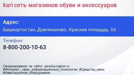 kari, сеть магазинов обуви и аксессуаров по адресу Башкортостан, Давлеканово, Красная площадь, 16 в дальнейшем Организация, размещена в следующих категориях: