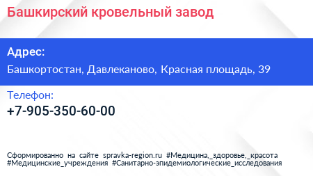 Башкирский кровельный завод по адресу Башкортостан, Давлеканово, Красная площадь, 39 в дальнейшем Организация, размещена в следующих категориях: