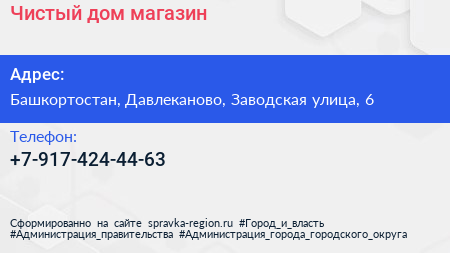 Чистый дом, магазин по адресу Башкортостан, Давлеканово, Заводская улица, 6 в дальнейшем Организация, размещена в следующих категориях: