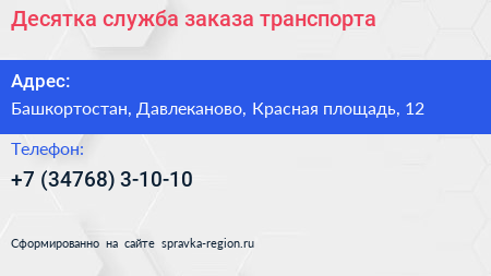 Десятка, служба заказа транспорта по адресу Башкортостан, Давлеканово, Красная площадь, 12 в дальнейшем Организация, размещена в следующих категориях: