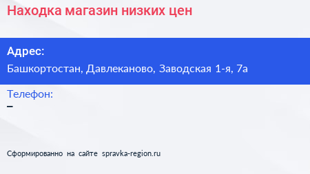 Находка, магазин низких цен по адресу Башкортостан, Давлеканово, Заводская 1-я, 7а в дальнейшем Организация, размещена в следующих категориях: