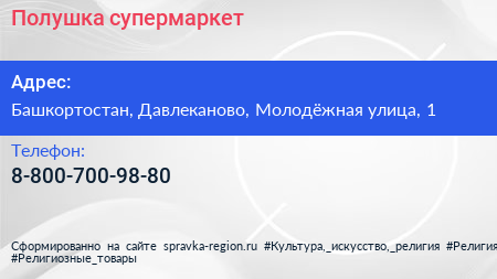 Полушка, супермаркет по адресу Башкортостан, Давлеканово, Молодёжная улица, 1 в дальнейшем Организация, размещена в следующих категориях: