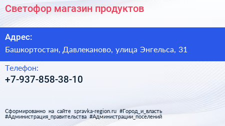 Светофор, магазин продуктов по адресу Башкортостан, Давлеканово, улица Энгельса, 31 в дальнейшем Организация, размещена в следующих категориях: