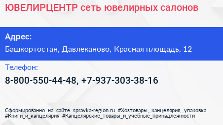 ЮВЕЛИРЦЕНТР, сеть ювелирных салонов по адресу Башкортостан, Давлеканово, Красная площадь, 12 в дальнейшем Организация, размещена в следующих категориях: