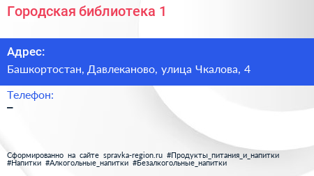 Городская библиотека №1 по адресу Башкортостан, Давлеканово, улица Чкалова, 4 в дальнейшем Организация, размещена в следующих категориях:
