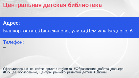 Центральная детская библиотека по адресу Башкортостан, Давлеканово, улица Демьяна Бедного, 6 в дальнейшем Организация, размещена в следующих категориях: