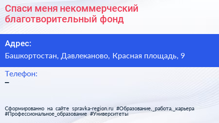 Спаси меня!, некоммерческий благотворительный фонд по адресу Башкортостан, Давлеканово, Красная площадь, 9 в дальнейшем Организация, размещена в следующих категориях: