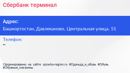 Сбербанк, терминал по адресу Башкортостан, Давлеканово, Центральная улица, 51 в дальнейшем Организация, размещена в следующих категориях: