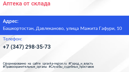 Аптека от склада по адресу Башкортостан, Давлеканово, улица Мажита Гафури, 10 в дальнейшем Организация, размещена в следующих категориях: