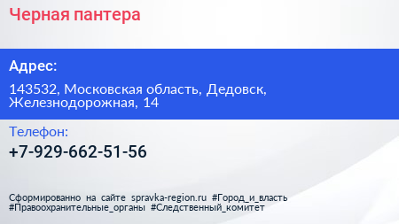 Черная пантера по адресу 143532, Московская область, Дедовск, Железнодорожная, 14 в дальнейшем Организация, размещена в следующих категориях: