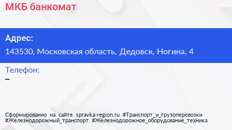 МКБ, банкомат по адресу 143530, Московская область, Дедовск, Ногина, 4 в дальнейшем Организация, размещена в следующих категориях: