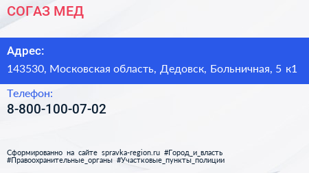 СОГАЗ-МЕД по адресу 143530, Московская область, Дедовск, Больничная, 5 к1 в дальнейшем Организация, размещена в следующих категориях: