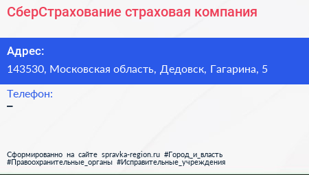 СберСтрахование, страховая компания по адресу 143530, Московская область, Дедовск, Гагарина, 5 в дальнейшем Организация, размещена в следующих категориях: