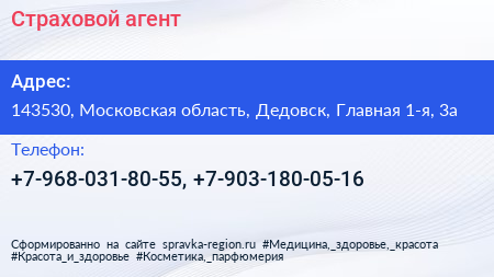 Страховой агент по адресу 143530, Московская область, Дедовск, Главная 1-я, 3а в дальнейшем Организация, размещена в следующих категориях: