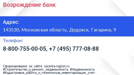 Возрождение, банк по адресу 143530, Московская область, Дедовск, Гагарина, 9 в дальнейшем Организация, размещена в следующих категориях:
